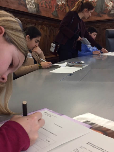 Photo: jeu de rôle d’une séance du conseil d’Etat animé par la Chancelière d’Etat en présence des élèves de 7P, classe de l’école de De-Budé, Petit-Saconnex.
